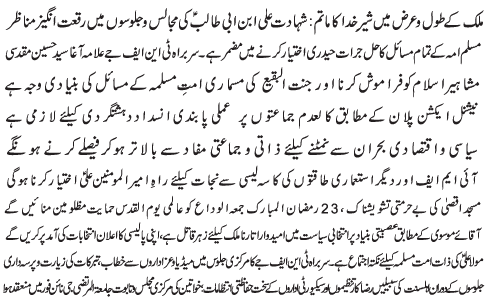 ISLAMABAD, April 9: Special security arrangements must be ensured during Majalis e Aza and Matami processions of the martyrdom of Ameeral Momineen Hazrat Ali (AS) - TNFJ |