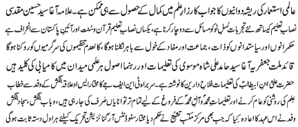 RAWALPINDI, April 17: Answer to the conspiracies of the colonial power lies in attaining pinnacle in the field of knowledge - Agha Hussain Muqadasi |