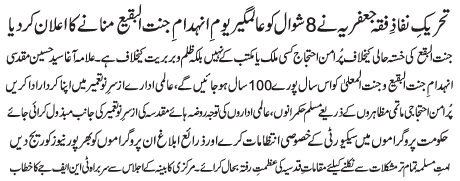 RAWALPINDI, April 18: Tehreek Nafaz e Fiqh e Jafariya announced the observation of the"Aalmgheer Youme Inhadame Jannat Al Baqee" on 8 Shawal |