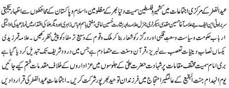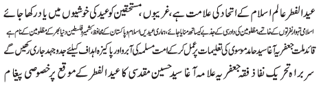 RAWALPINDI, April 22: Eidul Fitr is the symbol of unity of the Islamic world, remember destitute and needy in your happiness - Agha Muqadasi |