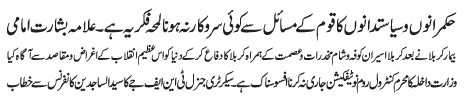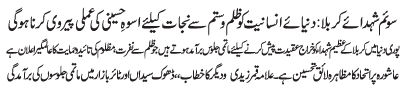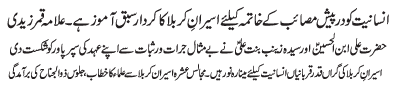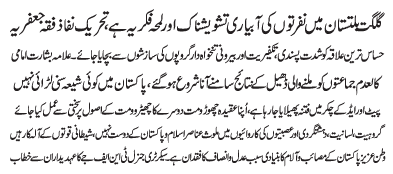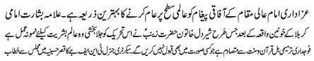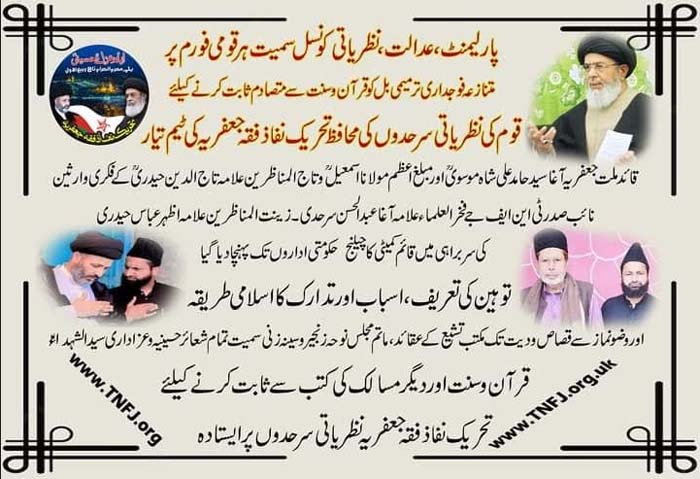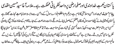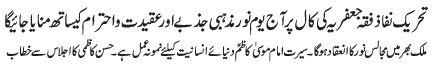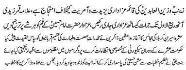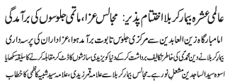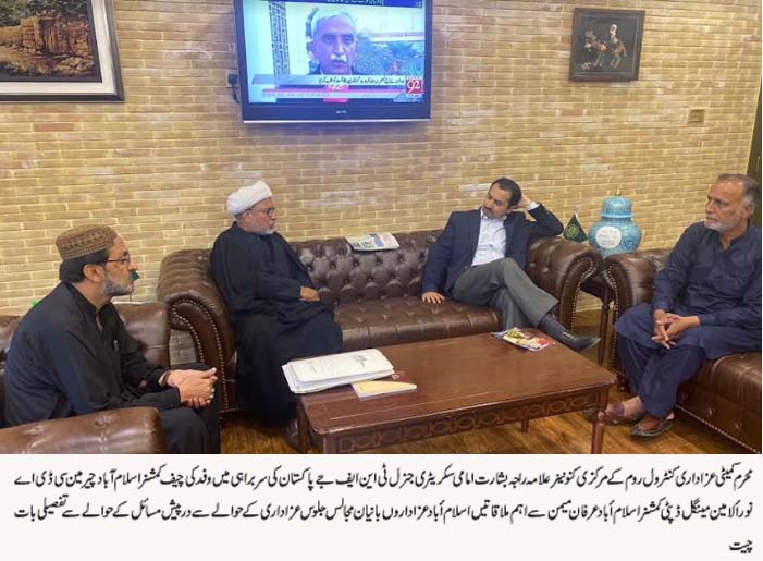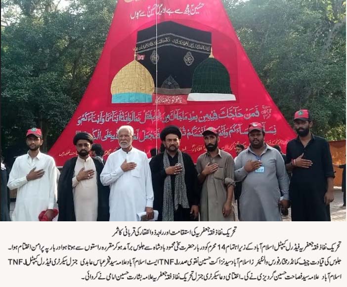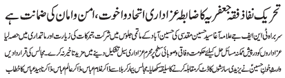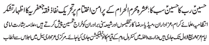 ISLAMABAD, August 2: Tehreek Nafaz e Fiqh e Jafariya appreciates all classes of societies and the administrations for peacefull completion of first ten days of Ayyam e Aza |