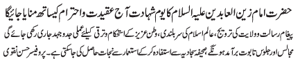 ISLAMABAD, August 13: The martyrdom anniversary of Imam Zain Al Abideen (AS) will be commemorated with great religious zeal and reverence |