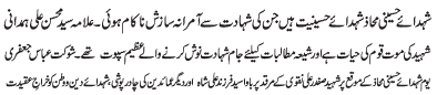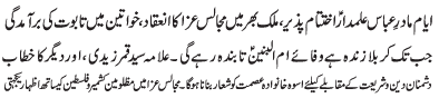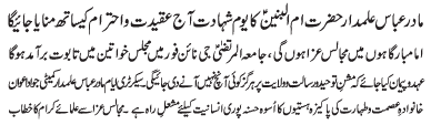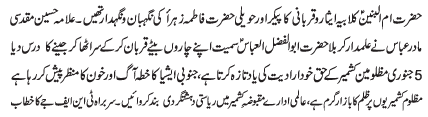 | RAWALPINDI, January 6: The martyrdom anniversary of the Mother of Hazrat Abbas Alamdar, Hazrat Ummal Banin (SA) will be commemorated today with great religious zeal and reverence | ||