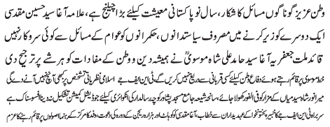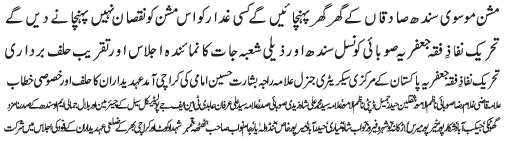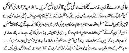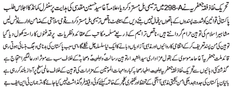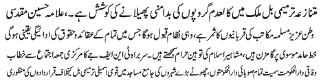 ISLAMABAD, January 20: Tehreek Nafaz e Fiqh e Jafariya rejects 298-A amendment bill; Allama Agha Syed Hussain Muqadasi calls of the meeting of the central command |