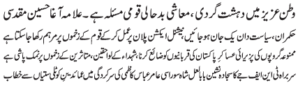 ISLAMABAD, January 14: The rulers and the politicians should resolve real issues; the lack of availability of everyday necessities poses questions - Agha Muqadasi |