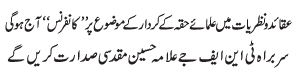 RAWALPINDI, January 8: Conference is being held today on the topic of the "role of Ulmae Haqa in propagation of beliefs and ideologies" |