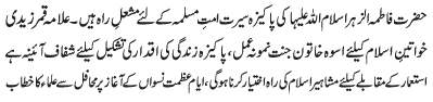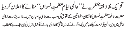 RAWALPINDI, January 9: The Tehreek Nafaz e Fiqh e Jafariya announced the observation of the"Aalmi Ayyam e Azmat e Niswaan" |