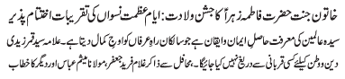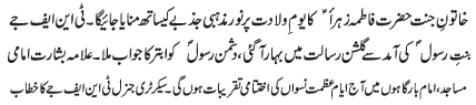 RAWALPINDI, January 13 The Zahoor Purnoor of Khatoon e Jannat, Hazrat Fatima Zahra (SA) will be celebrated today with great religious zeal and reverence - TNFJ |