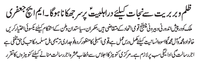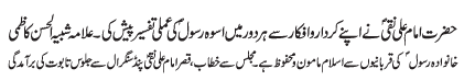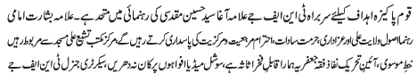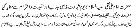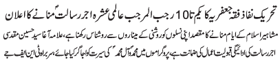 RAWALPINDI, January 19: The Tehreek Nafaz e Fiqh e Jafariya announced the observation of the "Aalmi Ashrae Ajre Rasalat" from 1-10 Rajab Almurajab |