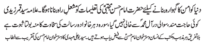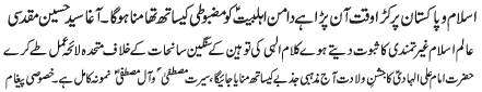 | ISLAMABAD, January 21: The controversial Amendment Bill is a try of the proscribed groups to cause unrest in the beloved country - Allama Hussain Muqadasi | ||