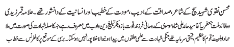 RAWALPINDI, January 5: Hazrat Ummal Banin (SA) is the symbol of selflessness and sacrifice and the caretaker and protector of the House of Hazrat Fatima Zahra (SA) - Hussain Muqadasi |