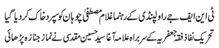 RAWALPINDI, January 18: Ghulam Mustafa Chohan passed away; the president of the TNFJ, Allama Agha Syed Hussain Muqadasi lead Namaz e Janaza |
