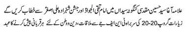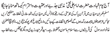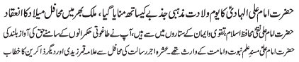 RAWALPINDI, January 29: Youme Warood Purnoor of Hazrat Imam Ali Al Hadi (AS) was celebrated with great religious zeal and reverence; Mahafil e Milaad held throughout the country |