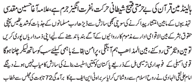 | ISLAMABAD, January 27: Blasphemy against the Holy Quran in Holland is an evil act and is a crime against humanity - Agha Muqadasi | ||