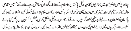 RAWALPINDI, January 31: Terrorist bomb blast on a Masjid at Police-Lines Peshawar is a heinous conspiracy against Pakistan and Islam - Agha Muqadasi |