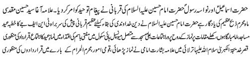 RAWALPINDI, July 3: The sacrifices of Hazrat Ismaeal (AS) and the Grandson of the Holy Prophet, Hazrat Imam Hussain (AS) gave eternal life to the message of Monotheism - Hussain Muqadasi |