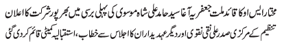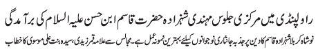 | RAWALPINDI, July 26: The Grandson of the Holy Prophet (SAWW), Imam Hussain (AS) defended Islam with the sacrifice of his pure blood - Qamar Zaidi | ||