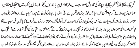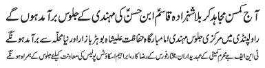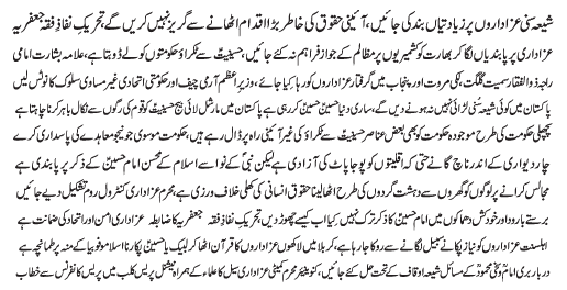 RAWALPINDI, July 19: Azadari is our jugular vein and therefore no restriction or hurdle will be tolerated on it - Hussain Muqadasi |