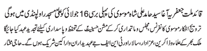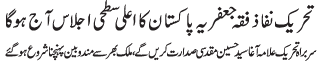 RAWALPINDI, July 15: The High level meeting of the Tehreek Nafaz e Fiqh e Jaffariya will take place today |