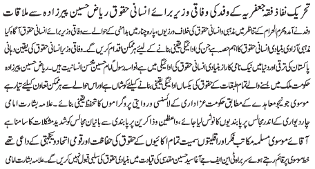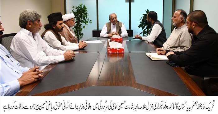 ISLAMABAD, July 14: The delegation of Tehreek Nafaz e Fiqh e Jaffariya met with the federal minister of human rites Riaz Hussain Pirzada |