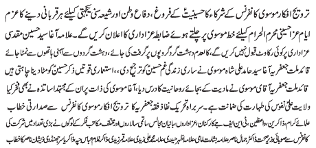 | RAWALPINDI, July 17: Participants of the conference "Tarweej e Afkaar e Moosavi" reiterate their stance to sacrifice all for the propagation of Hussainiat, defence of the country and unity of Sunni Shia | ||