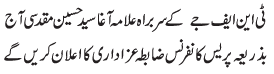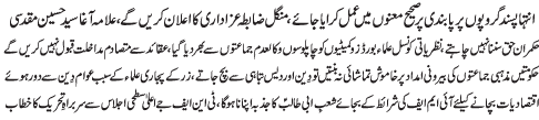 RAWALPINDI, July 18: Restrictions on the proscribed groups must be implemented properly, code of Azadari will be announced today - Agha Hussain Muqadasi |