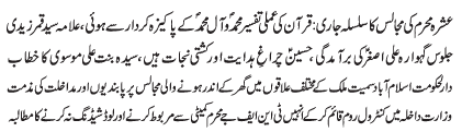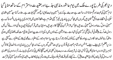 RAWALPINDI, July 31: Likewise throughout the the world, countrywide the day of Ashura was commemorated with great religious zeal and reverence |