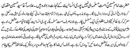 RAWALPINDI, July 29: Hazrat Imam Hussain (AS) is not only the saviour of the Islamic Nation but for the whole of humanity - Hussain Muqadasi |