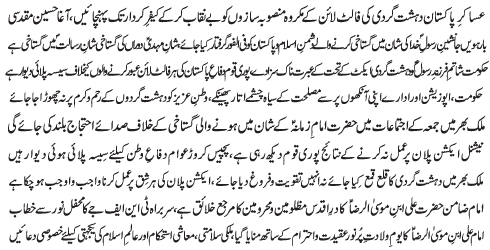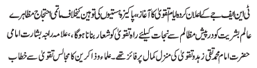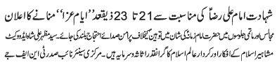 | ISLAMABAD, June 8: TNFJ announced the observation of Ayyam e Aza from 21-23 Zeeqaad to commemorate the martyrdom of Imam Ali Raza (AS) | ||