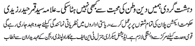 | RAWALPINDI, June 9: Terrorism could not stop us loving the religion and the country - Qamar Zaidi | ||