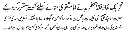 ISLAMABAD, June 17: Tehreek Nafaz e Fiqh e Jafariya nominated conveners to oversee the programs of Ayyam e Taqwa |
