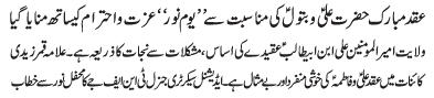 | RAWALPINDI, June 21: Anniversary of Aqad Mubarak of Hazrat Ali and Batool (AS) was celebrated to day as "Youme Noor" | ||