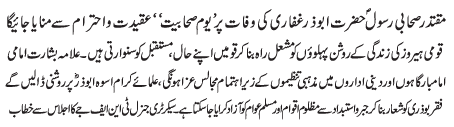 RAWALPINDI, June 22: Youme Sahabeat will be observed to mark the death anniversary of pious companion of the Holy Prophet, Hazrat AbuZr Ghafari (RA) |