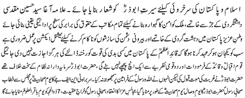 RAWALPINDI, June 25: Pious character of Hazrat Bu Zr must be followed for the success of Islam and Pakistan - Hussain Muqadasi |