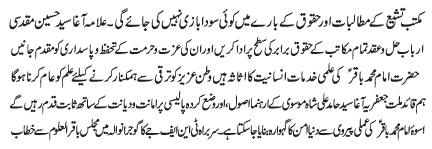 | RAWALPINDI, June 27: There will be no compromise when it comes to the rights and demands of Maktab e Tasheyyo - Hussain Muqadasi | ||
