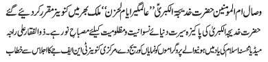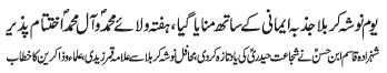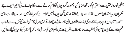 | RAWALPINDI, March 8: Warood Masood of Hazrat Imam Mahdi (AS) will be celebrated today as the "Youme Adal" - TNFJ | ||