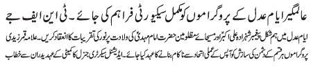 | ISLAMABAD, March 2: Complete security arrangements must be ensured during the programs of Alamgheer Ayyam e Adal - TNFJ | ||