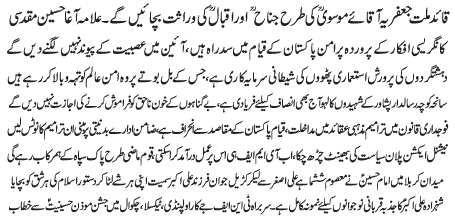 RAWALPINDI, March 6: Likewise the Quaid e Millat e Jafariya Aqae Moosavi, we will protect the legacy of Jinnah and Iqbal - Agha Muqadasi |