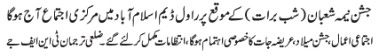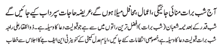 | ISLAMABAD, March 7: Tonight is Shub Barat, Mahafil will be held supplication will be offered, requests will be put in rivers and lakes | ||