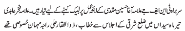 RAWALPINDI, March 19: Special meeting of the central cabinet of the Tehreek Nafaz e Fiqh e Jafariya has been summoned |