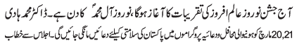 RAWALPINDI, March 22: Jashan e Nouroz was celebrated with great religious respect; proscribed groups should be banned from working - TNFJ |