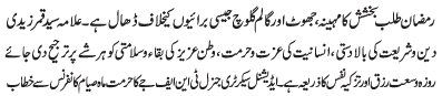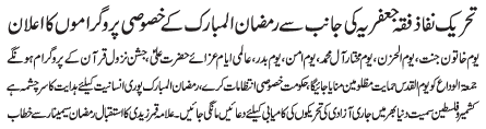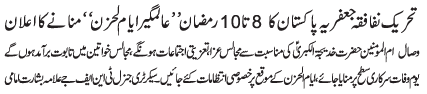 ISLAMABAD, March 28: Tehreek Nafaze Fiqh e Jafariya announced the observation of Alamgheer Ayyam al Huzn from 8-10 Ramzan al Muabarak |