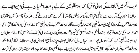 | RAWALPINDI, March 25: Reinstating of relationship between Arab and Ajam is a good news and is a breath of fresh air for oppressors - TNFJ | ||