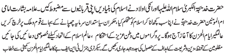 ISLAMABAD, March 30: Hazrat Khadijatal Kubra (SA) and her children sacrificed their lives to strengthen the foundation of Islam - Allama Basharat Imami |