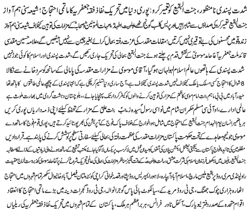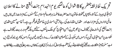 | RAWALPINDI, March 31: The Tehreek Nafaz e Fiqh e Jafariya announced the observation of the "Alamgheer Youm e Inhadame Janatal Baqi on 8 Shawal | ||