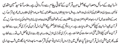 | RAWALPINDI, March 25: The real reason of humanity surrounded by hardships is due to deviating from the teachings of the Holy Quran - Hussain Muqadasi | ||