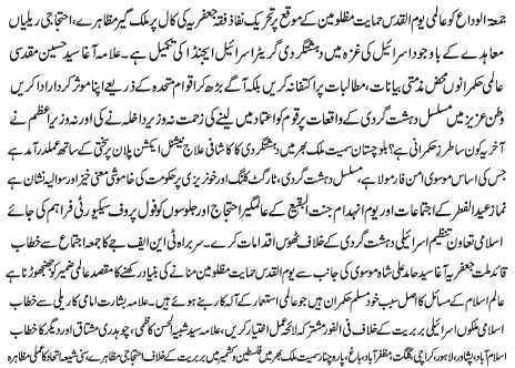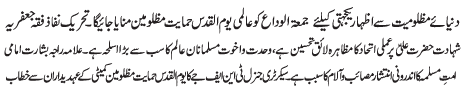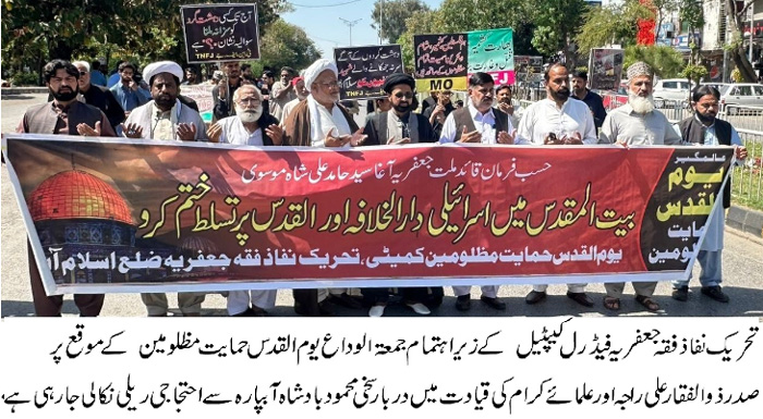 | ISLAMABAD, March 26: Youmal Quds Hamaeyat Mazloomeen will be observed on Jumatul Wida to express solidarity with the oppressed of the world - TNFJ | ||