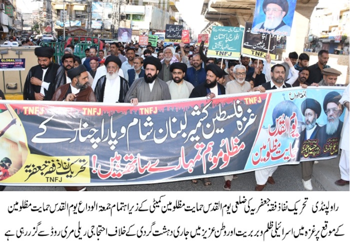 | RAWALPINDI, March 27: On the call of the TNFJ, solidarity with oppressed was expressed during protest rallies on Jumatal Wida | ||