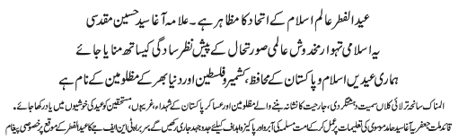 | RAWALPINDI, March 21: Eidul Fitr is the symbol of unity of Islamic world - Hussain Muqadasi | ||