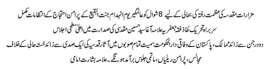 RAWALPINDI, March 28: On the call of the Tehreek Nafaz e Fiqh e Jaffariya, peaceful protests will be held throughout the country on the occasion of the "Youme Inhadam e Jannat al Baqi" |